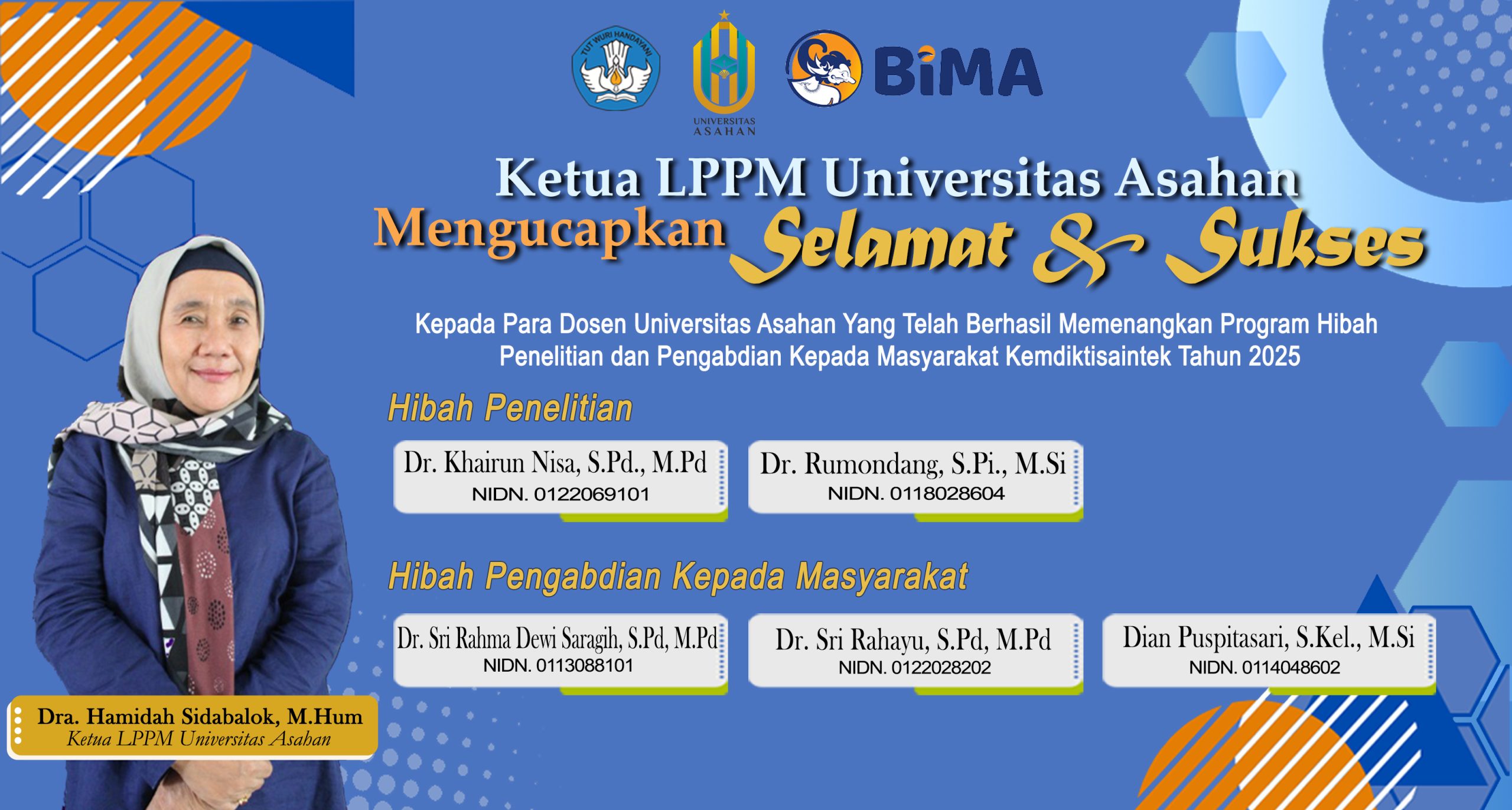 Keluarga Besar Lembaga Penelitian dan Pengabdian Kepada Masyarakat (LPPM) Universitas Asahan Mengucapkan Selamat dan Sukses Kepada para penerima dana hibah Penelitian (2 Judul) dan Pengabdian kepada Masyarakat (3 Judul) Dari DPPM Kemendiktisaintek Tahun Anggaran 2025 di Lingkungan Universitas Asahan